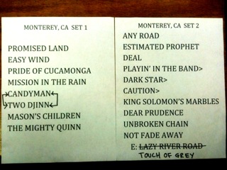 A very trippy show! I was outside when they started Promised Land,but got in quickly and went up front on Phil's side in bleachers/stands! Was hanging out with my buddy Lance from the Philzone,and we had a rocking good time! Mason's Children jam WENT OUT THERE! They they close with Mighty Quinn! I was dancing the whole show,on my feet,and that is hard for me because I am disabled,but THE MUSIC JUST KEPT ME GOING! It was the best Estimated I have ever seen this band do,and the Deal was a welcome rockin' surprise! Playin>Dark Star>Caution>Dark Star was really trippy,and it took King Solomon's Marbles to bring us back to earth and rockin' again! Dear Prudence was really good,and Sunshine really shined on background vocals on this one! Unbroken Chain took me up to this higher level of trippy consciuosness and trance,then they brought me back down to earth with Not Fade Away! Touch of Grey was a great encore,and off into the Monterey night we went! WE GONNA PREACHER WANG DANG DOODLE ALL NIGHT LONG!!!!!!!!!Love Eddieboy,THANKS FURTHUR!!!!!!!!!